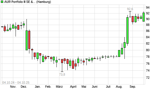 Mit dem Anstieg auf 92,20 EUR hat die AUR PORTFOLIO III SE-Aktie (ISIN DE000A40UTE1) am 03.10.2025 ein neues 12-Monats-Hoch erreicht und damit den Kurs vom 02.10.2025 eingestellt.Die AUR PORTFOLIO ...weiterlesen