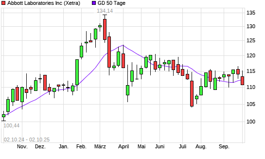 Mit dem Rücksetzer auf 111,80 EUR hat die Abbott Laboratories-Aktie am 01.10.2025 die 50-Tage-Linie nach unten gekreuzt.Die Abbott Laboratories-Aktie befindet sich seit dem 23.09.2025 im ...weiterlesen