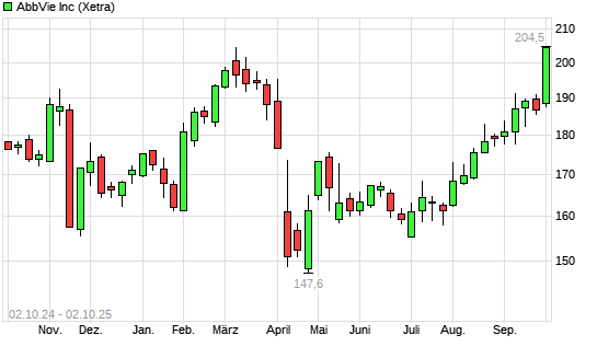 Mit dem Anstieg auf 207,50 EUR hat die Abbvie-Aktie (ISIN US00287Y1091) am 01.10.2025 ein neues All-Time-High erreicht und damit den Kurs vom 03.03.2025 eingestellt.Die Abbvie-Aktie befindet ...weiterlesen