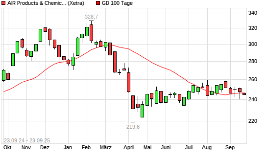 Mit dem Rücksetzer auf 245,80 EUR hat die Air Products & Chemicals-Aktie am 22.09.2025 die 100-Tage-Linie nach unten gekreuzt.Die Air Products & Chemicals-Aktie befindet sich seit dem ...weiterlesen