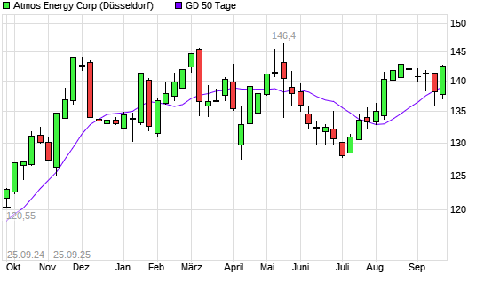 Mit dem Anstieg auf 140,90 EUR hat die Atmos Energy-Aktie am 24.09.2025 die 50-Tage-Linie nach oben gekreuzt.Die Atmos Energy-Aktie befindet sich seit dem 08.08.2025 im langfristigen Aufwärtstrend ...weiterlesen
