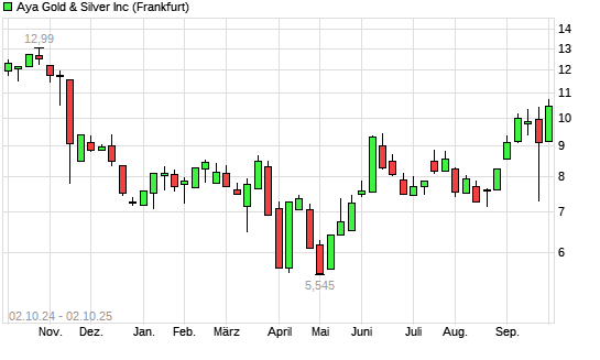 Mit dem Anstieg auf 10,60 EUR hat die Aya Gold & Silver-Aktie (ISIN CA05466C1095) am 01.10.2025 ein neues 6-Monats-Hoch erreicht und damit den Kurs vom 22.09.2025 eingestellt.Die Aya Gold & ...weiterlesen