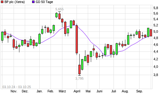 BP ist Teil des 1681 Titel umfassenden Anlageuniversum der boerse.de-Signale Aktien Welt. In der großen Trendauswertung vom 19.09.2025 ist der Titel von Rang 898 auf Rang 876 aufgestiegen.Gesteuert ...weiterlesen