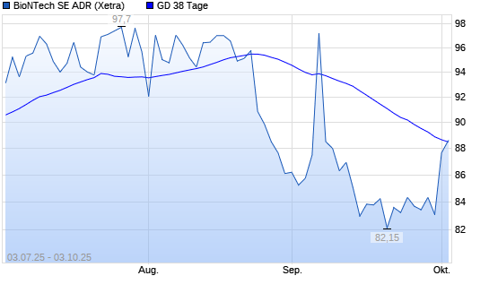 Mit dem Rücksetzer auf 87,45 EUR hat die BioNTech-Aktie am 02.10.2025 die 38-Tage-Linie nach unten gekreuzt.Die BioNTech-Aktie befindet sich seit dem 04.06.2025 im langfristigen Abwärtstrend ...weiterlesen