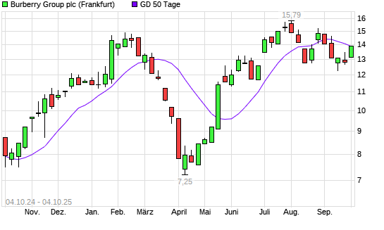 Mit dem Anstieg auf 13,90 EUR hat die Burberry Group-Aktie am 03.10.2025 die 50-Tage-Linie nach oben gekreuzt.Die Burberry Group-Aktie befindet sich seit dem 14.05.2025 im langfristigen Aufwärtstrend ...weiterlesen