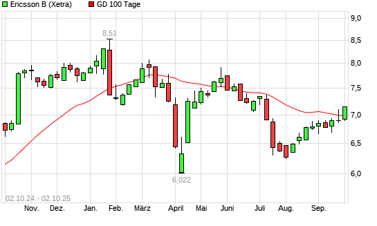 Mit dem Anstieg auf 7,05 EUR hat die Ericsson B-Aktie am 01.10.2025 die 100-Tage-Linie nach oben gekreuzt.Die Ericsson B-Aktie befindet sich seit dem 12.06.2025 im langfristigen Abwärtstrend ...weiterlesen