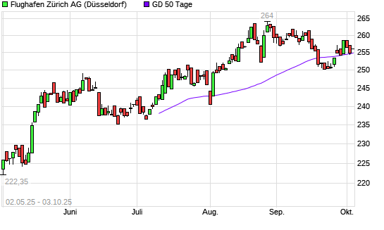 Mit dem Rücksetzer auf 253,20 EUR hat die Flughafen Zürich-Aktie am 02.10.2025 die 50-Tage-Linie nach unten gekreuzt.Der Abstand zur 200-Tage-Linie beträgt aktuell +6,80%. ...weiterlesen