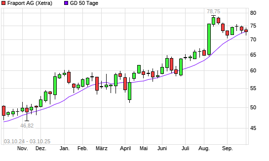 Mit dem Rücksetzer auf 71,95 EUR hat die Fraport-Aktie am 02.10.2025 die 50-Tage-Linie nach unten gekreuzt.Die Fraport-Aktie befindet sich seit dem 08.11.2024 im langfristigen Aufwärtstrend ...weiterlesen