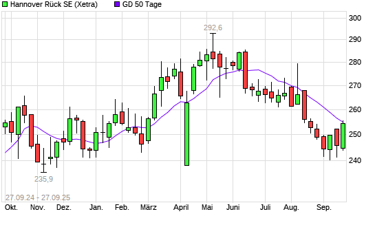 Mit dem Anstieg auf 255,60 EUR hat die Hannover Rück-Aktie am 26.09.2025 die 50-Tage-Linie nach oben gekreuzt.Die Hannover Rück-Aktie befindet sich seit dem 12.08.2025 im langfristigen ...weiterlesen