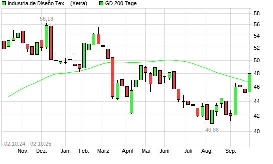 Mit dem Anstieg auf 47,71 EUR hat die Inditex-Aktie am 01.10.2025 die 200-Tage-Linie nach oben gekreuzt.Die Inditex-Aktie befand sich seit dem 12.03.2025 im langfristigen Aufwärtstrend und hat ...weiterlesen