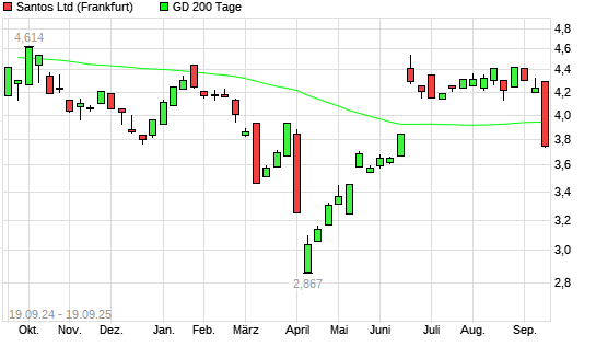 Mit dem Rücksetzer auf 3,88 EUR hat die Santos-Aktie am 18.09.2025 die 200-Tage-Linie nach unten gekreuzt.Die Santos-Aktie befand sich seit dem 16.06.2025 im langfristigen Aufwärtstrend ...weiterlesen