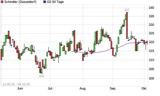 Mit dem Rücksetzer auf 319,35 EUR hat die Schindler-Aktie am 03.10.2025 die 50-Tage-Linie nach unten gekreuzt.Die Schindler-Aktie befindet sich seit dem 29.11.2023 im langfristigen Aufwärtstrend ...weiterlesen