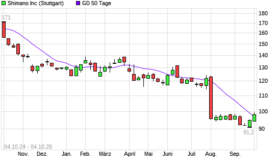 Mit dem Anstieg auf 98,45 EUR hat die Shimano-Aktie am 03.10.2025 die 50-Tage-Linie nach oben gekreuzt.Die Shimano-Aktie befindet sich seit dem 22.10.2024 im langfristigen Abwärtstrend und hat ...weiterlesen
