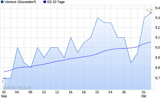 Mit dem Anstieg auf 9,20 EUR hat die Venture-Aktie am 01.10.2025 die 20-Tage-Linie nach oben gekreuzt.Die Venture-Aktie befindet sich seit dem 31.07.2025 im langfristigen Aufwärtstrend und hat ...weiterlesen
