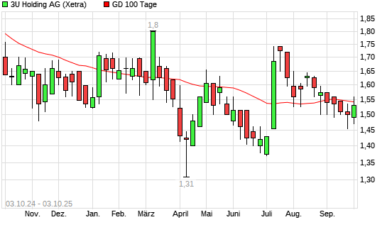 Mit dem Rücksetzer auf 1,48 EUR hat die 3U Holding-Aktie am 02.10.2025 die 100-Tage-Linie nach unten gekreuzt.Die 3U Holding-Aktie befindet sich seit dem 24.09.2025 im langfristigen Abwärtstrend ...weiterlesen