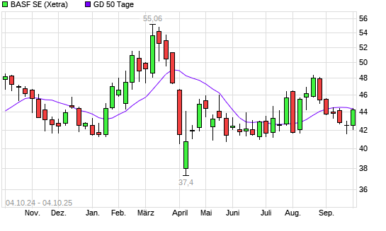 Mit dem Anstieg auf 44,36 EUR hat die BASF-Aktie am 03.10.2025 die 50-Tage-Linie nach oben gekreuzt.Die BASF-Aktie befindet sich seit dem 03.09.2025 im langfristigen Abwärtstrend und hat in ...weiterlesen