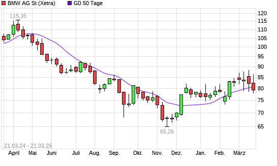 Mit dem Rücksetzer auf 80,46 EUR hat die BMW St-Aktie am 20.03.2025 die 50-Tage-Linie nach unten gekreuzt.Die BMW St-Aktie befindet sich seit dem 14.02.2025 im langfristigen Abwärtstrend ...weiterlesen