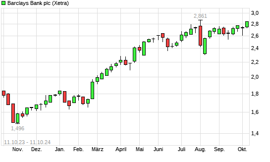 Mit dem Anstieg auf 2,80 EUR hat die Barclays Bank-Aktie (ISIN GB0031348658) am 10.10.2024 ein neues 5-Jahres-Hoch erreicht und damit den Kurs vom 29.07.2024 eingestellt.Die Barclays Bank-Aktie ...weiterlesen