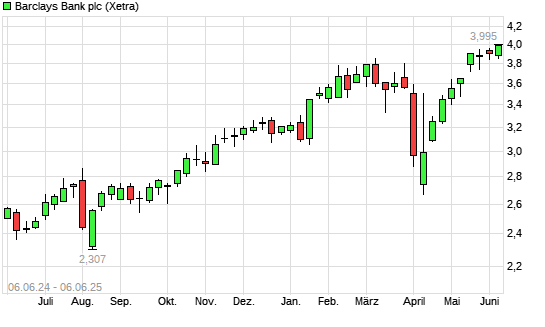 Mit dem Anstieg auf 3,96 EUR hat die Barclays Bank-Aktie (ISIN GB0031348658) am 05.06.2025 ein neues 5-Jahres-Hoch erreicht und damit den Kurs vom 20.05.2025 eingestellt.Die Barclays Bank-Aktie ...weiterlesen