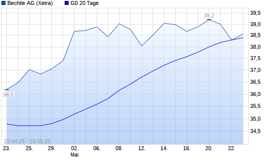 Mit dem Rücksetzer auf 38,28 EUR hat die Bechtle-Aktie am 22.05.2025 die 20-Tage-Linie nach unten gekreuzt.Die Bechtle-Aktie befindet sich seit dem 22.04.2025 im langfristigen Aufwärtstrend ...weiterlesen