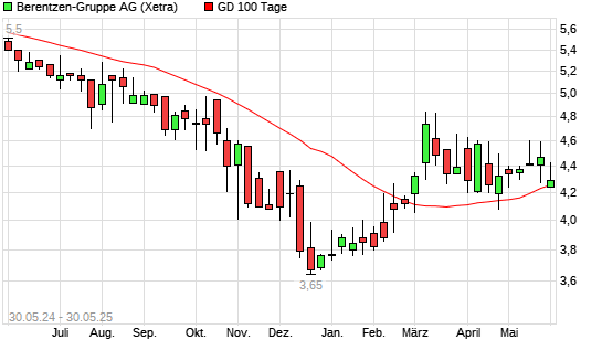 Mit dem Anstieg auf 4,24 EUR hat die Berentzen-Aktie am 29.05.2025 die 100-Tage-Linie nach oben gekreuzt.Die Berentzen-Aktie befindet sich seit dem 27.05.2025 im langfristigen Abwärtstrend und ...weiterlesen