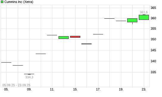 Mit dem Anstieg auf 362,30 EUR hat die Cummins-Aktie (ISIN US2310211063) am 22.09.2025 ein neues 6-Monats-Hoch erreicht und damit den Kurs vom 19.09.2025 eingestellt.Die Cummins-Aktie befindet ...weiterlesen