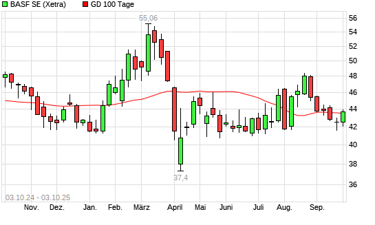 Mit dem Anstieg auf 43,63 EUR hat die BASF-Aktie am 02.10.2025 die 100-Tage-Linie nach oben gekreuzt.Die BASF-Aktie befindet sich seit dem 03.09.2025 im langfristigen Abwärtstrend und hat in ...weiterlesen