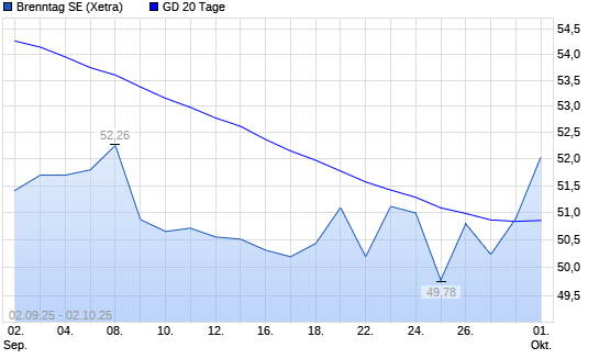 Mit dem Anstieg auf 51,78 EUR hat die Brenntag-Aktie am 01.10.2025 die 20-Tage-Linie nach oben gekreuzt.Die Brenntag-Aktie befindet sich seit dem 12.06.2025 im langfristigen Abwärtstrend und ...weiterlesen
