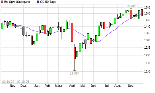 Mit dem Rücksetzer auf 14,87 EUR hat die ENI-Aktie am 02.10.2025 die 50-Tage-Linie nach unten gekreuzt.Die ENI-Aktie befindet sich seit dem 11.06.2025 im langfristigen Aufwärtstrend und ...weiterlesen