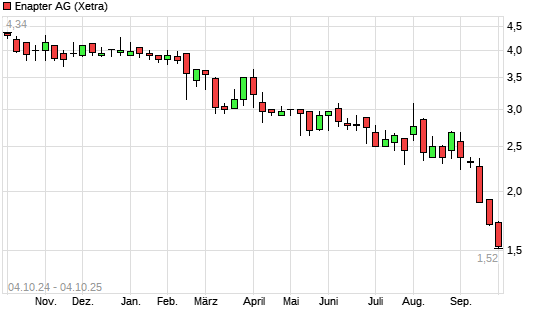 Mit dem Rücksetzer auf 1,50 EUR hat die Enapter (ex S&O Beteiligungen)-Aktie (ISIN DE000A255G02) am 03.10.2025 ein neues 5-Jahres-Tief erreicht und damit den Kurs vom 02.10.2025 eingestellt.Die ...weiterlesen