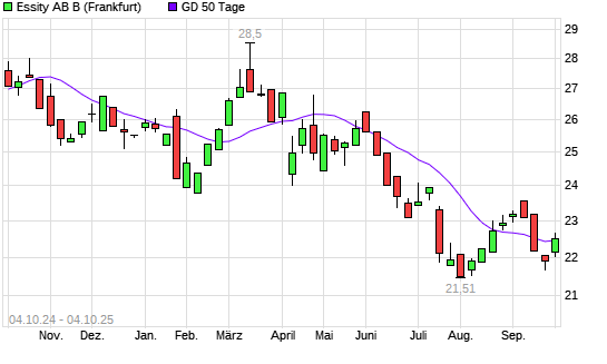 Mit dem Anstieg auf 22,51 EUR hat die Essity AB B-Aktie am 03.10.2025 die 50-Tage-Linie nach oben gekreuzt.Die Essity AB B-Aktie befindet sich seit dem 28.05.2025 im langfristigen Abwärtstrend ...weiterlesen