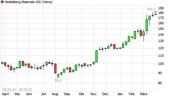 Mit dem Anstieg auf 181,50 EUR hat die Heidelberg Materials-Aktie (ISIN DE0006047004) am 25.03.2025 ein neues All-Time-High erreicht und damit den Kurs vom 19.03.2025 eingestellt.Die Heidelberg ...weiterlesen