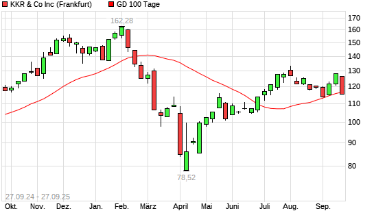 Mit dem Rücksetzer auf 115,86 EUR hat die KKR & Co.-Aktie am 26.09.2025 die 100-Tage-Linie nach unten gekreuzt.Die KKR & Co.-Aktie befindet sich seit dem 25.09.2025 im langfristigen ...weiterlesen