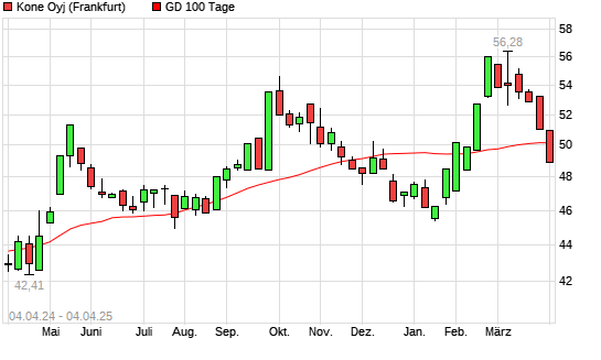 Mit dem Rücksetzer auf 50,00 EUR hat die Kone-Aktie am 03.04.2025 die 100-Tage-Linie nach unten gekreuzt.Die Kone-Aktie befindet sich seit dem 30.01.2025 im langfristigen Aufwärtstrend ...weiterlesen