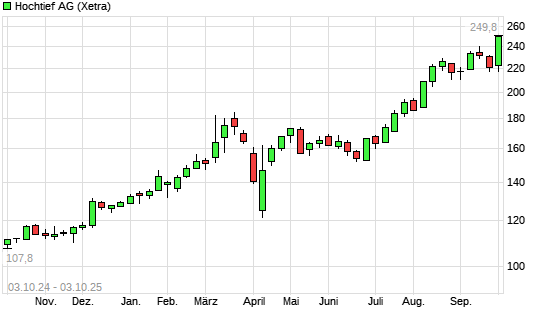 Mit dem Anstieg auf 247,00 EUR hat die Hochtief-Aktie (ISIN DE0006070006) am 02.10.2025 ein neues All-Time-High erreicht und damit den Kurs vom 15.09.2025 eingestellt.Die Hochtief-Aktie befindet ...weiterlesen