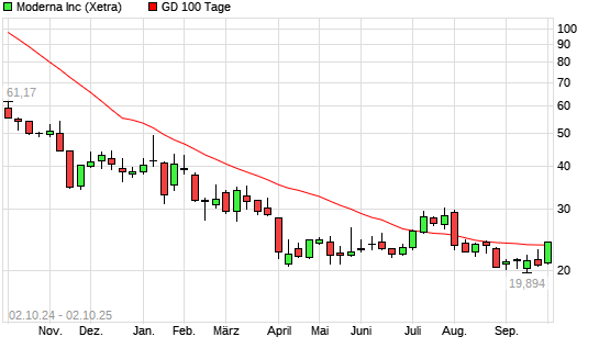 Mit dem Anstieg auf 23,84 EUR hat die Moderna-Aktie am 01.10.2025 die 100-Tage-Linie nach oben gekreuzt.Die Moderna-Aktie befindet sich seit dem 01.08.2024 im langfristigen Abwärtstrend und ...weiterlesen