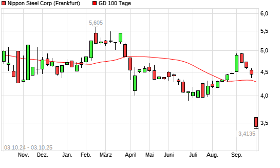Mit dem Rücksetzer auf 3,44 EUR hat die Nippon Steel-Aktie am 02.10.2025 die 100-Tage-Linie nach unten gekreuzt.Die Nippon Steel-Aktie befindet sich seit dem 25.09.2025 im langfristigen ...weiterlesen