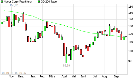Mit dem Anstieg auf 117,58 EUR hat die Nucor-Aktie am 02.10.2025 die 200-Tage-Linie nach oben gekreuzt.Die Nucor-Aktie befand sich seit dem 01.10.2025 im langfristigen Abwärtstrend und hat in ...weiterlesen