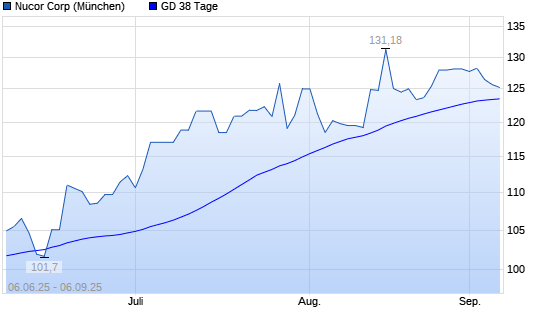 Mit dem Rücksetzer auf 122,48 EUR hat die Nucor-Aktie am 05.09.2025 die 38-Tage-Linie nach unten gekreuzt.Die Nucor-Aktie befindet sich seit dem 11.08.2025 im langfristigen Aufwärtstrend ...weiterlesen