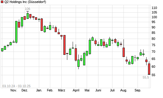 Mit dem Rücksetzer auf 57,50 EUR hat die Q2 Holding-Aktie (ISIN US74736L1098) am 02.10.2025 ein neues 12-Monats-Tief erreicht und damit den Kurs vom 09.04.2025 eingestellt.Die Q2 Holding-Aktie ...weiterlesen