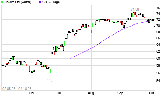 Mit dem Rücksetzer auf 71,32 EUR hat die Holcim-Aktie am 03.10.2025 die 50-Tage-Linie nach unten gekreuzt.Die Holcim-Aktie befindet sich seit dem 23.06.2025 im langfristigen Abwärtstrend ...weiterlesen