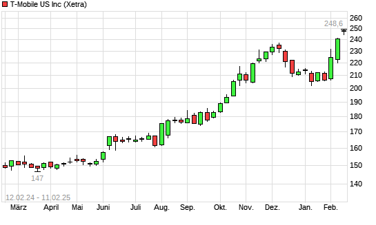 Mit dem Anstieg auf 245,75 EUR hat die T-Mobile US-Aktie (ISIN US8725901040) am 10.02.2025 ein neues All-Time-High erreicht und damit den Kurs vom 07.02.2025 eingestellt.Die T-Mobile US-Aktie ...weiterlesen