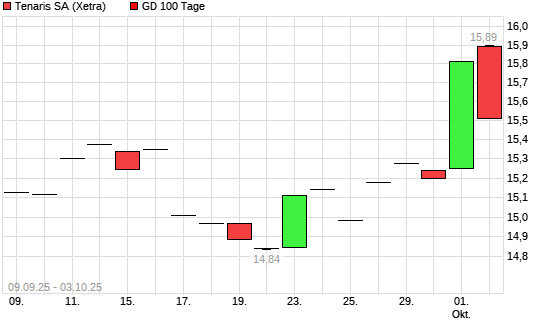 Mit dem Anstieg auf 15,74 EUR hat die Tenaris-Aktie am 02.10.2025 die 100-Tage-Linie nach oben gekreuzt.Die Tenaris-Aktie befindet sich seit dem 04.04.2025 im langfristigen Abwärtstrend und ...weiterlesen