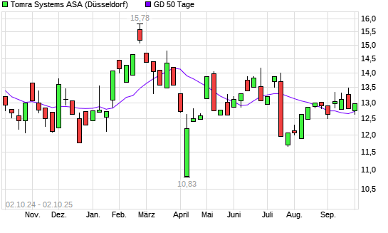 Mit dem Anstieg auf 13,01 EUR hat die Tomra Systems-Aktie am 01.10.2025 die 50-Tage-Linie nach oben gekreuzt.Die Tomra Systems-Aktie befindet sich seit dem 22.09.2025 im langfristigen Abwärtstrend ...weiterlesen