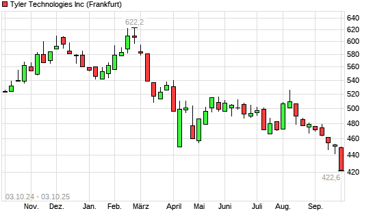 Mit dem Rücksetzer auf 425,20 EUR hat die Tyler Techs-Aktie (ISIN US9022521051) am 02.10.2025 ein neues 12-Monats-Tief erreicht und damit den Kurs vom 01.10.2025 eingestellt.Die Tyler Techs-Aktie ...weiterlesen