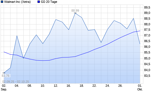 Mit dem Rücksetzer auf 86,89 EUR hat die Walmart-Aktie am 01.10.2025 die 20-Tage-Linie nach unten gekreuzt.Die Walmart-Aktie befindet sich seit dem 12.09.2025 im langfristigen Aufwärtstrend ...weiterlesen
