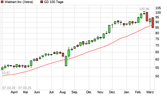 Mit dem Rücksetzer auf 87,72 EUR hat die Walmart-Aktie am 06.03.2025 die 100-Tage-Linie nach unten gekreuzt.Die Walmart-Aktie befindet sich seit dem 09.01.2024 im langfristigen Aufwärtstrend ...weiterlesen