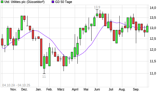 Mit dem Rücksetzer auf 13,10 EUR hat die United Utilities-Aktie am 03.10.2025 die 50-Tage-Linie nach unten gekreuzt.Die United Utilities-Aktie befindet sich seit dem 04.09.2025 im langfristigen ...weiterlesen