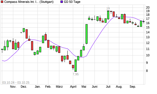 Mit dem Anstieg auf 16,20 EUR hat die Compass Minerals-Aktie am 02.10.2025 die 50-Tage-Linie nach oben gekreuzt.Die Compass Minerals-Aktie befindet sich seit dem 25.04.2025 im langfristigen ...weiterlesen