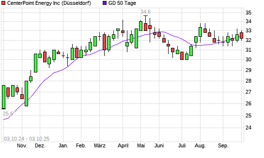 Mit dem Rücksetzer auf 32,00 EUR hat die CenterPoint Energy-Aktie am 02.10.2025 die 50-Tage-Linie nach unten gekreuzt.Die CenterPoint Energy-Aktie befindet sich seit dem 18.09.2025 im langfristigen ...weiterlesen